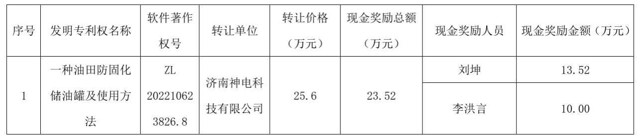 根据《山东石油化工学院科技成果转化办法(试行)》[2022(78)号文件],现对我校“一种油田防固化储油罐及使用方法”发明专利权转化现金奖励相关信息公示如下:
