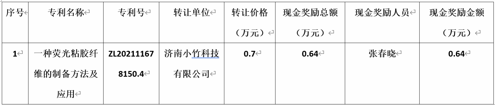 根据《山东石油化工学院科技成果转化办法(试行)》[2022(78)号文件],现对我校“一种荧光粘胶纤维的制备方法及应用”专利转化现金奖励相关信息公示如下:
