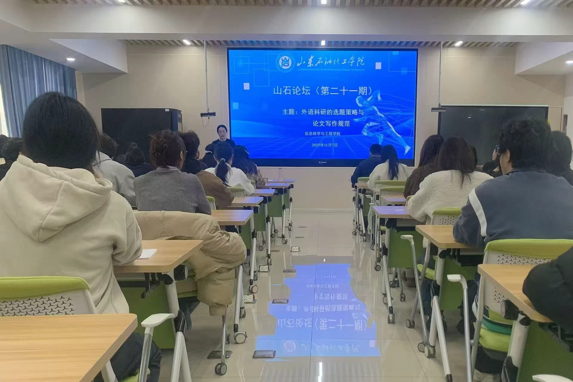 11月7日,由科研处主办、信息科学与工程学院承办的第二十一期“山石论坛”在第二教学楼304会议室顺利举行。本期论坛邀请北京工商大学语言与传播学院英语系田莉副教授来校,为外语系全体教师和2023级英语专业全体师生作“外语科研的选题策略与论文写作规范”专题讲座。