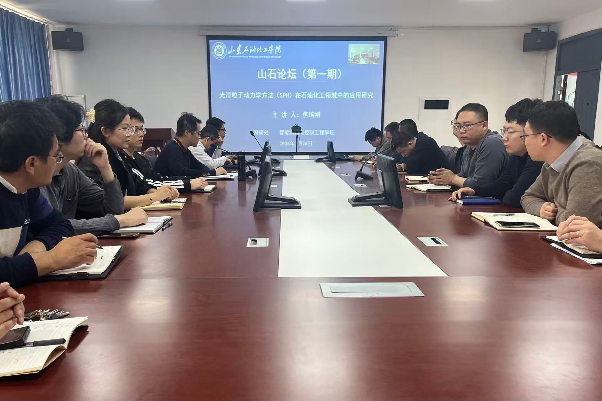 3月26日下午,由科研处主办、智能制造与控制工程学院承办的第一期 “山石论坛” 在学院南馆 237 会议室顺利举行。本期论坛特邀山东交通学院工程机械学院副院长焦培刚,为现场 40 余名师生作题为“光滑粒子动力学方法(SPH)在石油化工领域中的应用研究”的学术报告。